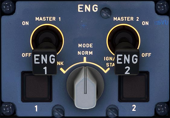 The Engine Panel is used to control and start the engines. It contains Master Switches for each engine and also an Ignition Mode Switch for starting or cranking the engine.